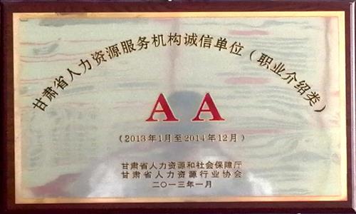 2013年2月公司職介所被甘肅省人力資源和社會保障局、甘肅省人力資源行業(yè)協(xié)會授予“AA級誠信單位”;